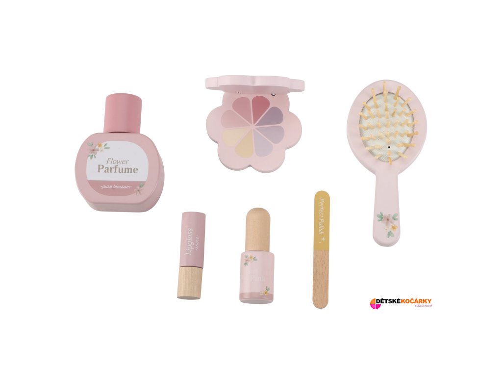 - sada obsahuje toaletní stolek se zrcadlem, kartáč na vlasy, parfém, rtěnku, oční stíny, pilník a lak na nehty