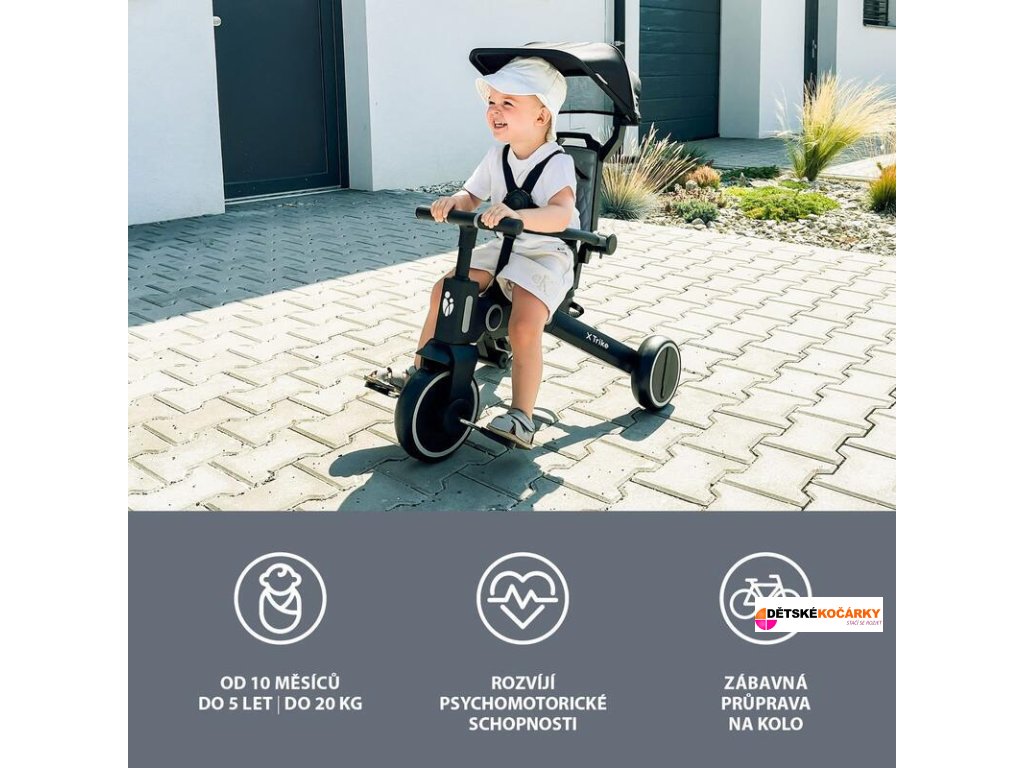 Vodící tyč, opěrka zad, odpojitelná šlapátka, odnímatelná stříška, možnost po i proti směru jízdy, 5-ti bodový bezpečnostní pás, snadné složení – to je v základních bodech tříkolka ZOPA X Trike. S možností upravit výšku vodící tyče a deaktivací řídítek může plně suplovat kočárek, přičemž dětem poskytne více zábavy během jízdy. Děti mohou využít odnímatelná šlapátka buď jako pedály a řídit tříkolku samy, nebo jako opěrku pro menší nožičky. Polstrovaný podsedák a opěrka zad garantují pohodlnější zážitek, navíc opěrku i podsedák lze snadno vyčistit, jelikož jsou tyto části odnímatelné.