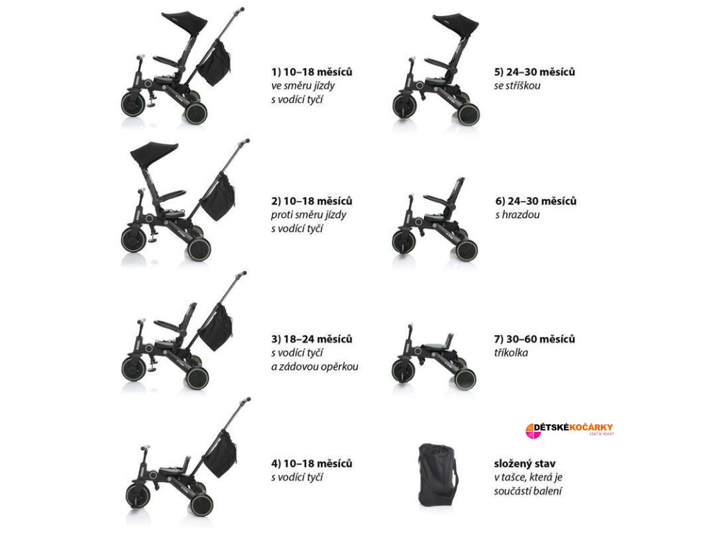 - odpojitelné pedály, zádová opěrka, vodící tyč, stříška