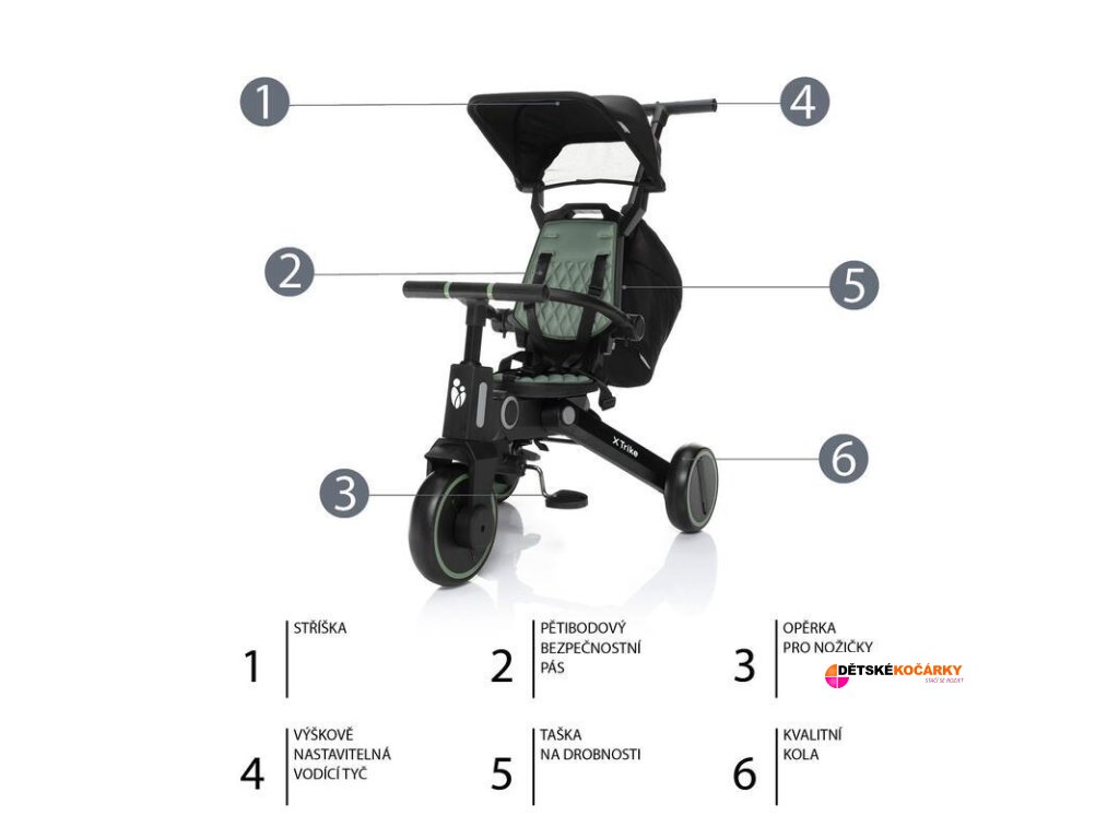 - odpojitelné pedály, zádová opěrka, vodící tyč, stříška