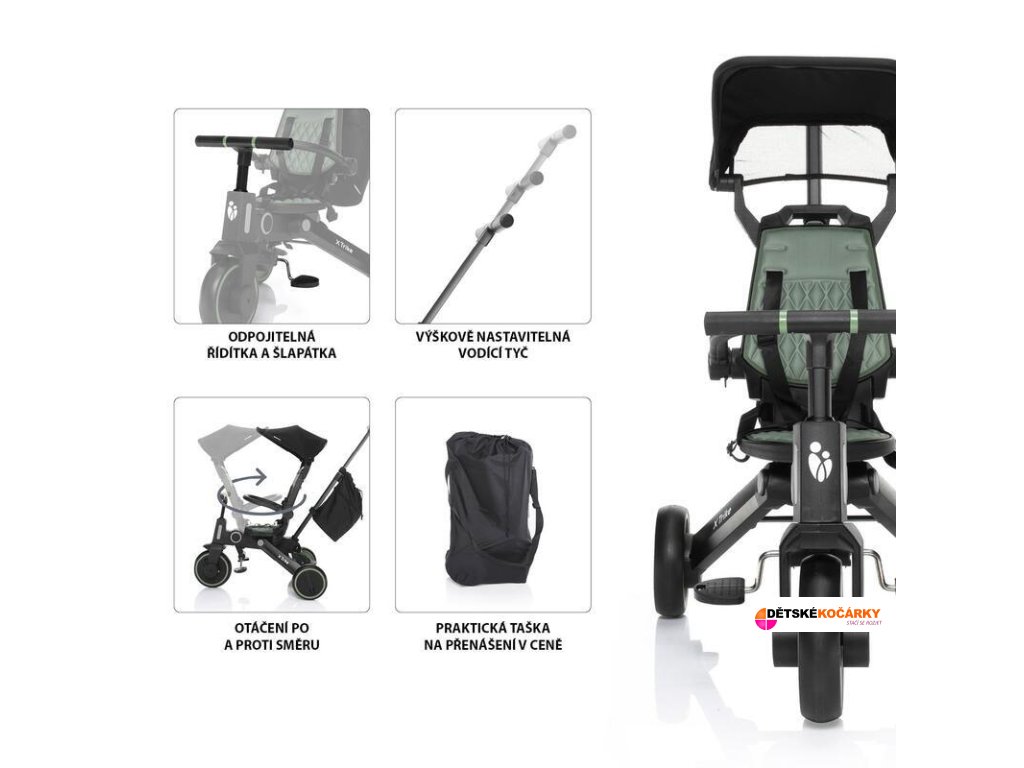 Vodící tyč, opěrka zad, odpojitelná šlapátka, odnímatelná stříška, možnost po i proti směru jízdy, 5-ti bodový bezpečnostní pás, snadné složení – to je v základních bodech tříkolka ZOPA X Trike. S možností upravit výšku vodící tyče a deaktivací řídítek může plně suplovat kočárek, přičemž dětem poskytne více zábavy během jízdy. Děti mohou využít odnímatelná šlapátka buď jako pedály a řídit tříkolku samy, nebo jako opěrku pro menší nožičky. Polstrovaný podsedák a opěrka zad garantují pohodlnější zážitek, navíc opěrku i podsedák lze snadno vyčistit, jelikož jsou tyto části odnímatelné.