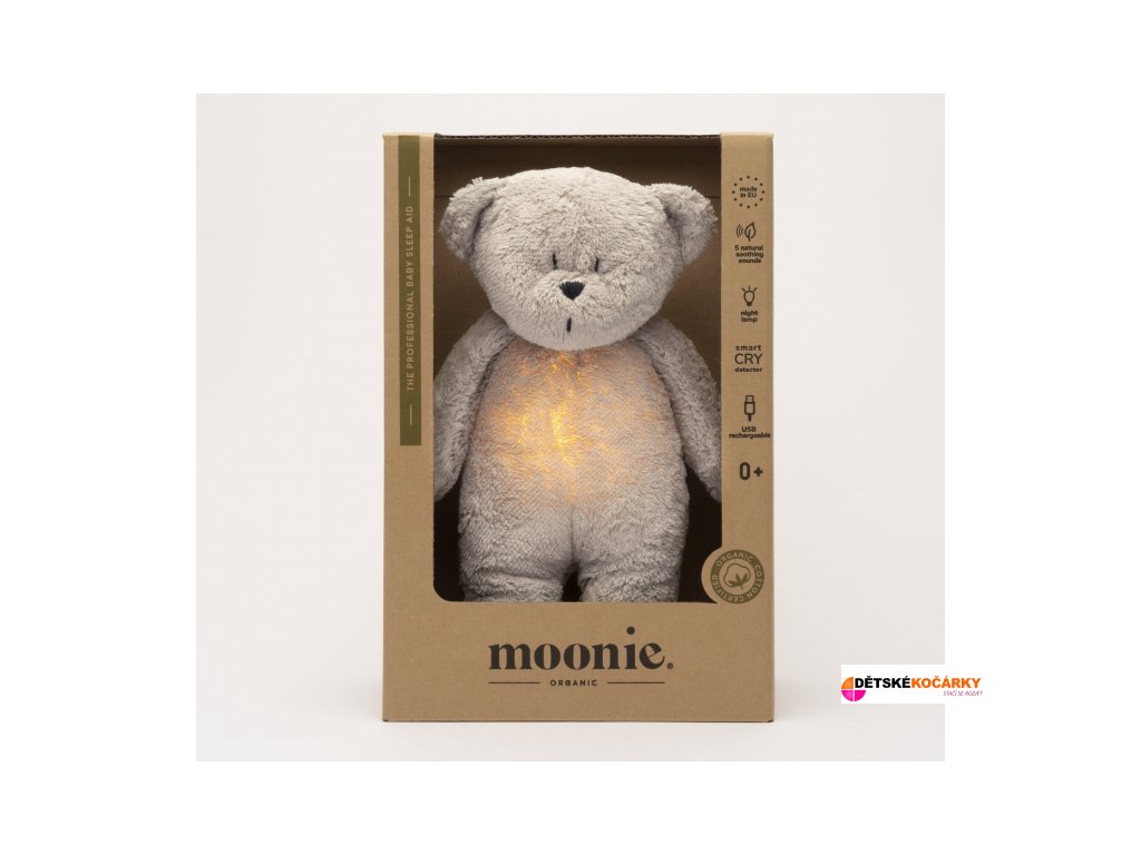 Usínáček MOONIE v podobě roztomilého medvídka s nočním světlem a relaxačními zvuky pomáhá miminku uklidnit se a snáze usnout. Uklidňující zvuky připomínají dítěti prostředí v děloze maminky před jeho narozením. Usínáček nabízí pět přírodních relaxačních zvuků (tlukot srdce, vítr, lesní potok, mořské vlny, déšť), kalimba ukolébavku, dvě klasické ukolébavky a umožňuje nahrání vlastního hlasu. Bříško zajíčka svítí a slouží jako noční světlo s výběrem sedmi barev svícení. Jemné světlo pomáhá dítěti cítit se v postýlce bezpečně. Světlo je možné zapnout i bez zvuků. Při zapnuté funkci Shake světlo zapnete zatřesením hračkou. Zajíček se při svícení nijak nezahřívá a je pro dítě zcela bezpečný.