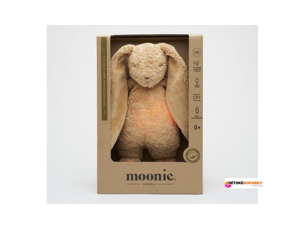 Usínáček MOONIE v podobě roztomilého zajíčka s nočním světlem a relaxačními zvuky pomáhá miminku uklidnit se a snáze usnout. Uklidňující zvuky připomínají dítěti prostředí v děloze maminky před jeho narozením. Usínáček nabízí pět přírodních relaxačních zvuků (tlukot srdce, vítr, lesní potok, mořské vlny, déšť), kalimba ukolébavku, dvě klasické ukolébavky a umožňuje nahrání vlastního hlasu. Bříško zajíčka svítí a slouží jako noční světlo s výběrem sedmi barev svícení. Jemné světlo pomáhá dítěti cítit se v postýlce bezpečně. Světlo je možné zapnout i bez zvuků. Při zapnuté funkci Shake světlo zapnete zatřesením hračkou. Zajíček se při svícení nijak nezahřívá a je pro dítě zcela bezpečný.
