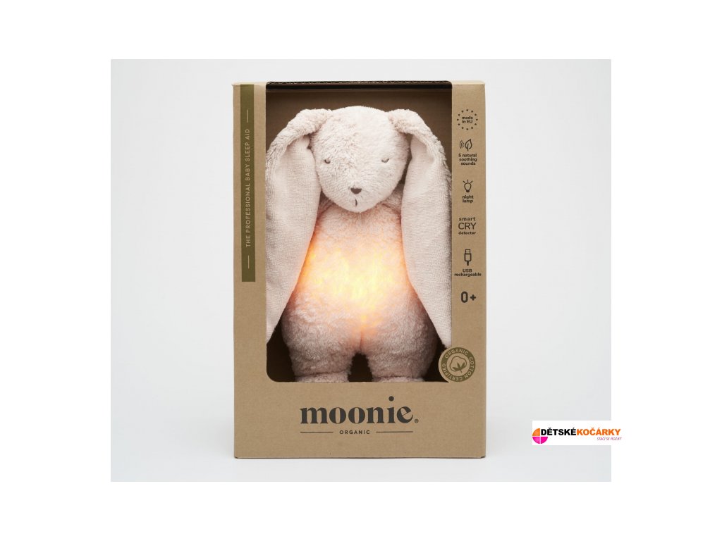 Usínáček MOONIE v podobě roztomilého zajíčka s nočním světlem a relaxačními zvuky pomáhá miminku uklidnit se a snáze usnout. Uklidňující zvuky připomínají dítěti prostředí v děloze maminky před jeho narozením. Usínáček nabízí pět přírodních relaxačních zvuků (tlukot srdce, vítr, lesní potok, mořské vlny, déšť), kalimba ukolébavku, dvě klasické ukolébavky a umožňuje nahrání vlastního hlasu. Bříško zajíčka svítí a slouží jako noční světlo s výběrem sedmi barev svícení. Jemné světlo pomáhá dítěti cítit se v postýlce bezpečně. Světlo je možné zapnout i bez zvuků. Při zapnuté funkci Shake světlo zapnete zatřesením hračkou. Zajíček se při svícení nijak nezahřívá a je pro dítě zcela bezpečný.