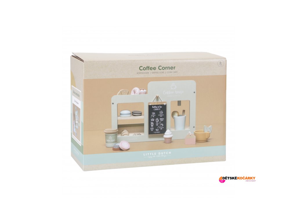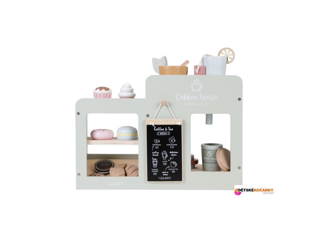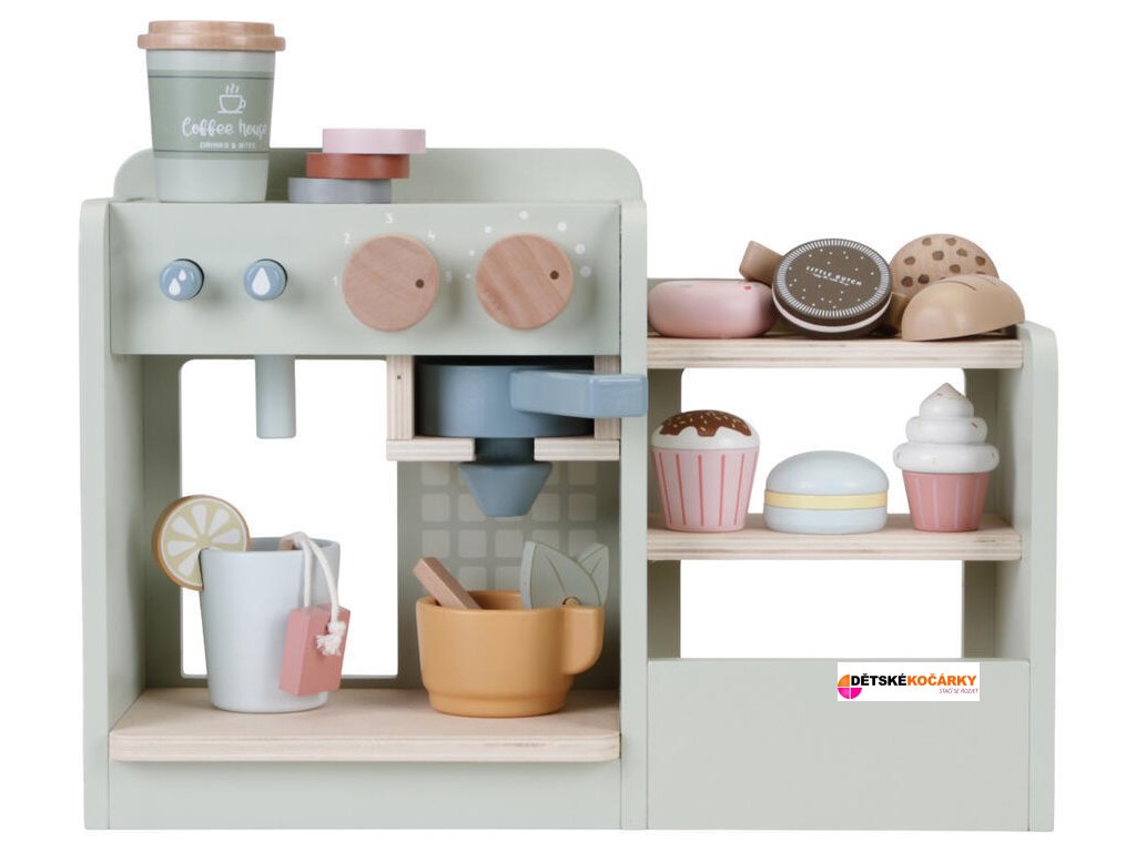 Dáte si kávu nebo čaj? S tímto dřevěným kávovarem LITTLE DUTCH s bohatým příslušenstvím si může vaše dítě otevřít doma vlastní kavárnu a pozvat vás na cappuccino či espresso spolu s dortíkem, koláčkem či sendvičem. Pro přípravu kávy stačí otočit knoflíkem, zmáčknout tlačítko a káva je hotová! Poličky s vystavenými zákusky lákají k ochutnání, nápojový lístek vám usnadní objednávání nápojů.