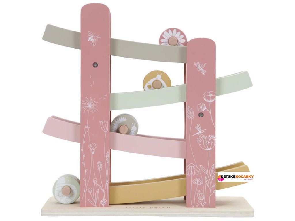 1, 2, 3, pojďme závodit! Vaše dítě si zamiluje tuto veselou dřevěnou dráhu LITTLE DUTCH se 4 potištěnými kolečky. Umístěte brouka, housenku, šneka a květinu jednoho po druhém na dráhu, uvolněte je a oni se rozběhnou dolů. Děti to milují!