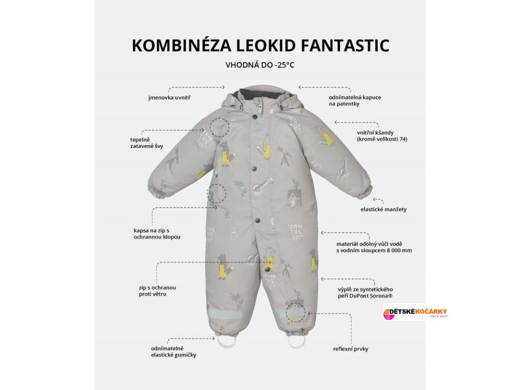 Praktická zimní kombinéze, která svým střihem a provedením bude vyhovovat jak dětem sedícím na kočárku, tak staším dětem do 5 let. Kombinéza je vyrobená z tkanin odolným proti opotřebení s vodoodpudivou impregnací, její výplň pak tvoří syntetické peří DuPont Sorona. Tato kombinace materiálů umožňuje kombinéze udržovat dítě v teple i při -25 ° C.